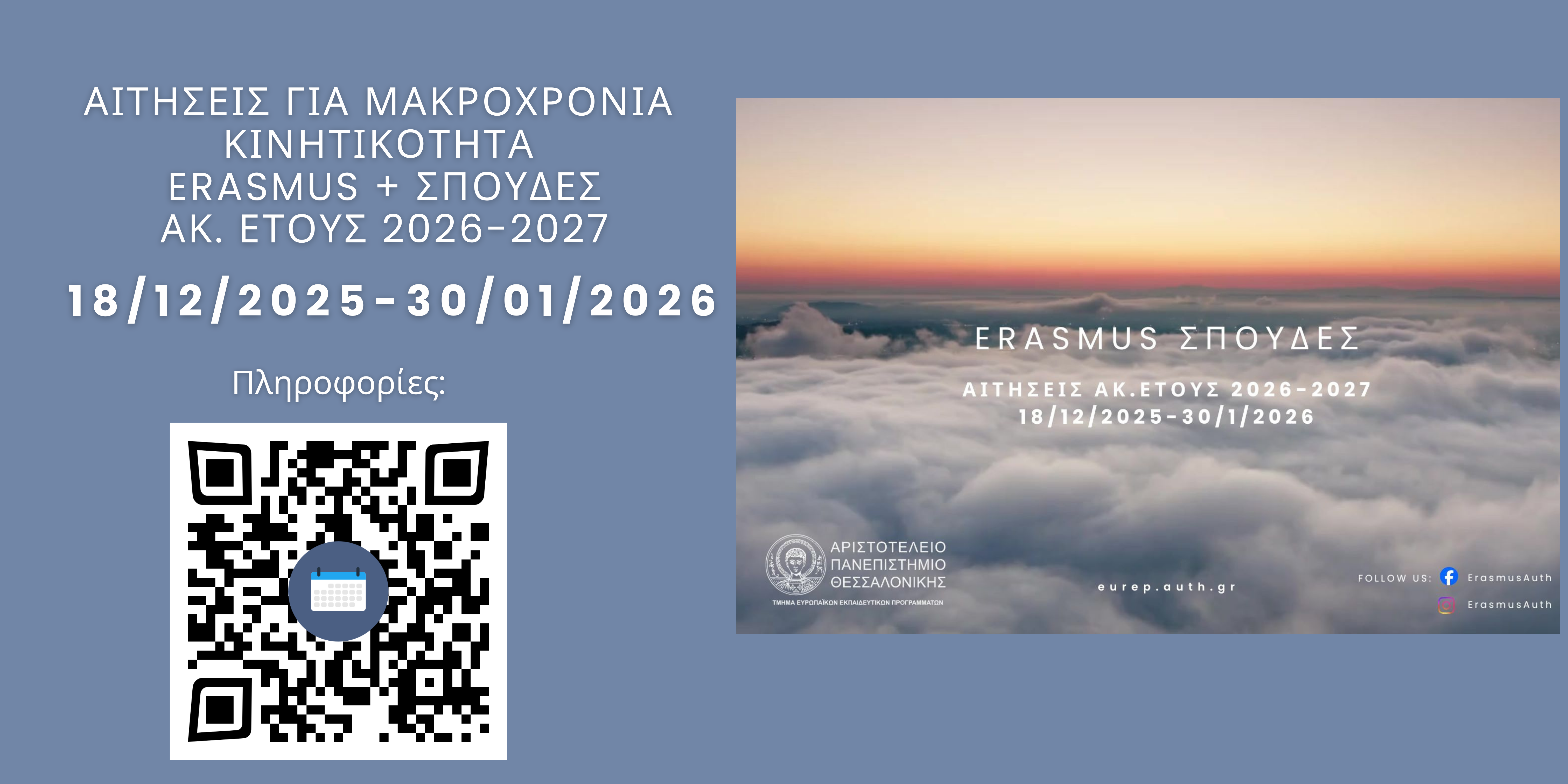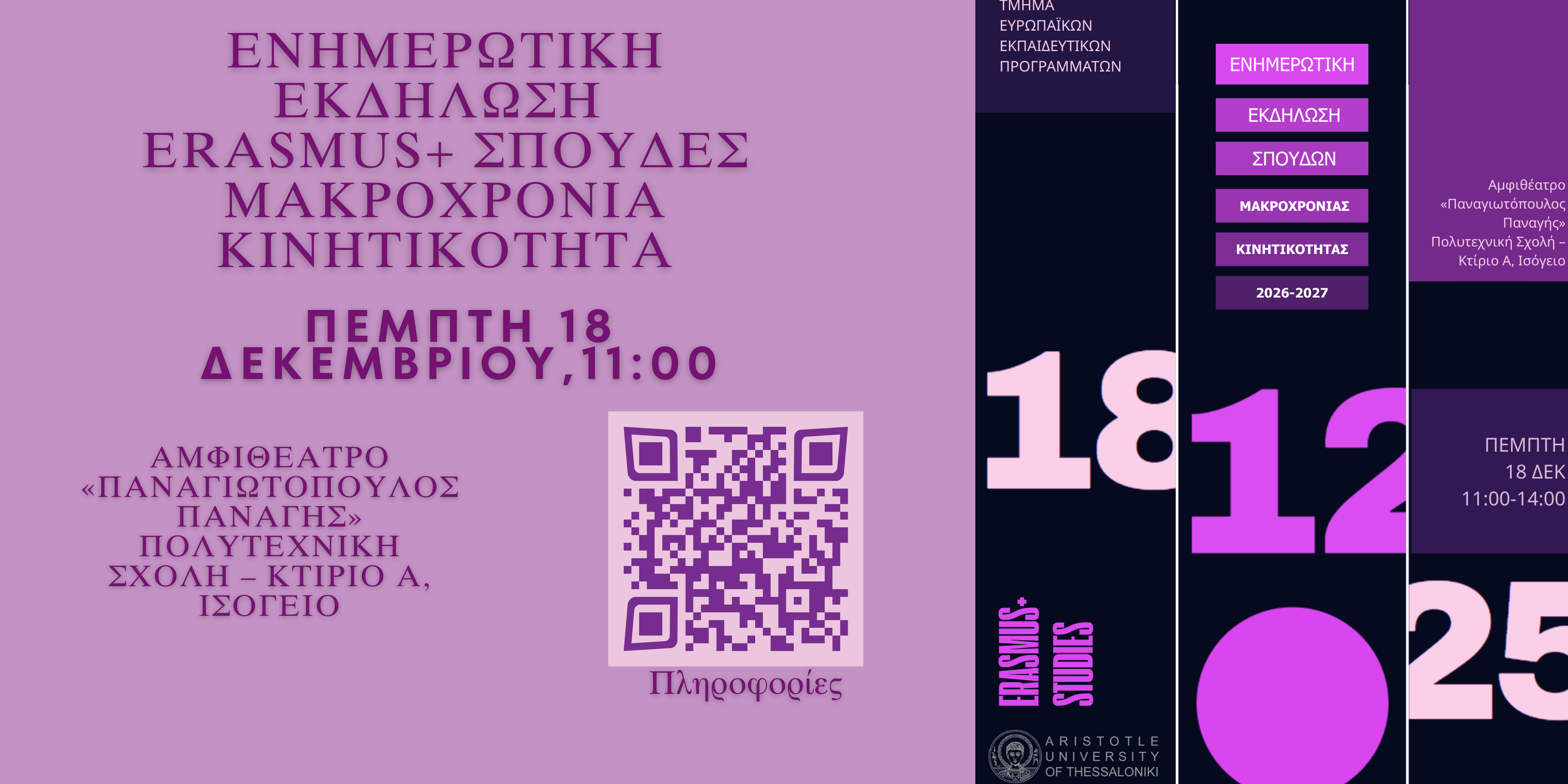 | Πέμ, 18/12/2025 - 11:00 | Πέμ, 18/12/2025 - 14:00 | Ενημερωτική εκδήλωση για την υποβολή αιτήσεων ΜΑΚΡΟΧΡΟΝΙΑΣ κινητικότητας Erasmus+ για Σπουδές ακαδ. έτους 2026-2027 |
