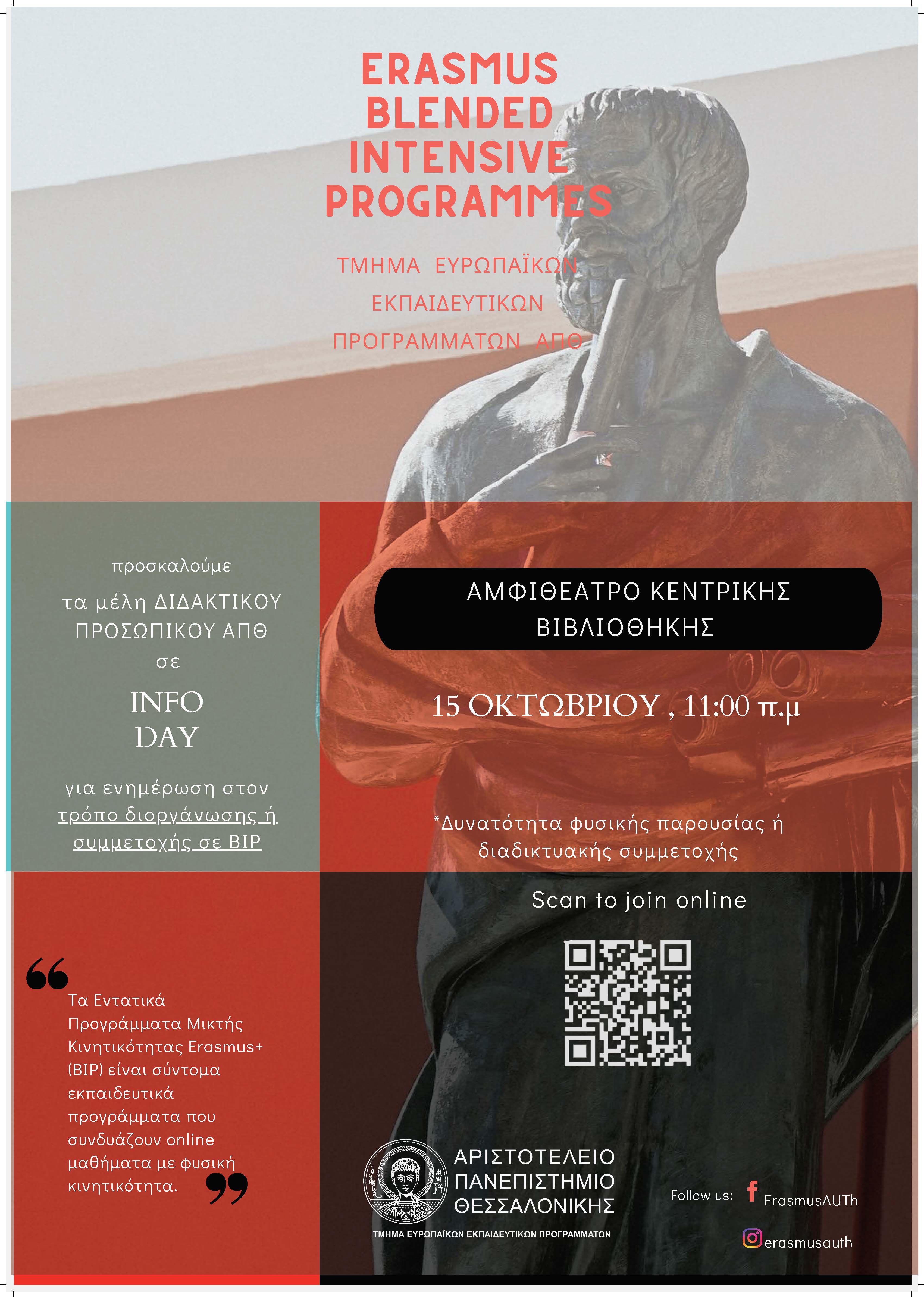 Το Τμήμα Ευρωπαϊκών Εκπαιδευτικών Προγραμμάτων διοργανώνει ενημερωτική εκδήλωση σχετικά με τις δυνατότητες συμμετοχής ή/και διοργάνωσης Εντατικών Προγραμμάτων Μικτής Κινητικότητας Erasmus+ (Blended Intensive Programmes/BIP), και προσκαλεί τα μέλη του διδακτικού προσωπικού του ιδρύματος την Τετάρτη 15 Οκτωβρίου και ώρα 11:00 πμ στο Αμφιθέατρο της Κεντρικής Βιβλιοθήκης. Η εκδήλωση θα είναι υβριδική και επομένως σε περίπτωση αδυναμίας φυσικής παρουσίας, οι ενδιαφερόμενοι/ες μπορούν να συμμετέχουν μέσω του συνδέσμου https://shorturl.at/yK9v2.