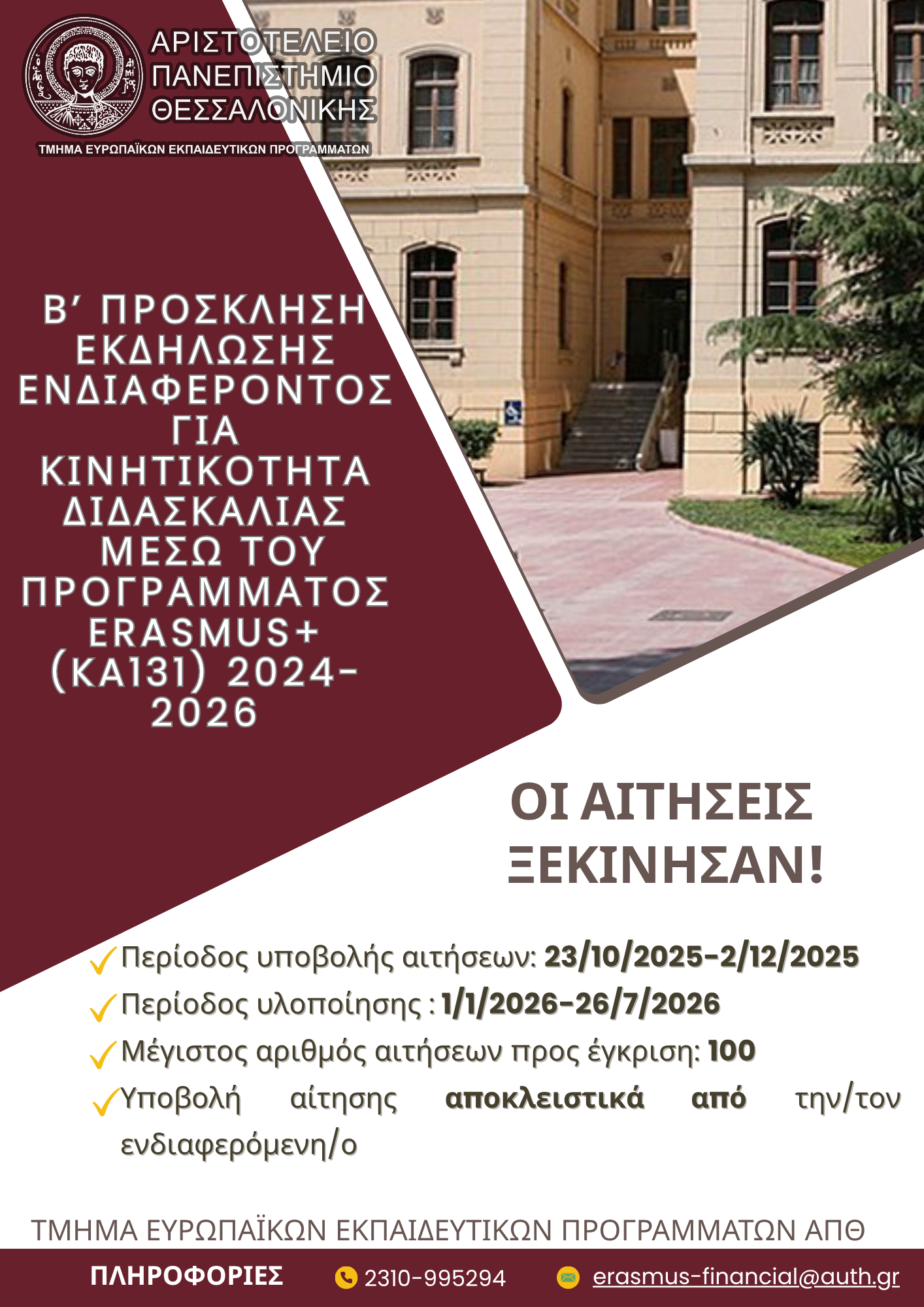 Το Τμήμα Ευρωπαϊκών Εκπαιδευτικών Προγραμμάτων, στο πλαίσιο του προγράμματος ERASMUS+ (KA131) 2024-2026, ανακοινώνει την Β΄ Πρόσκληση Εκδήλωσης Ενδιαφέροντοςγια κινητικότητα του διδακτικού προσωπικού του Α.Π.Θ. για Διδασκαλία σε ευρωπαϊκά εκπαιδευτικά ιδρύματα (βάσει ενεργών συμφωνιών).