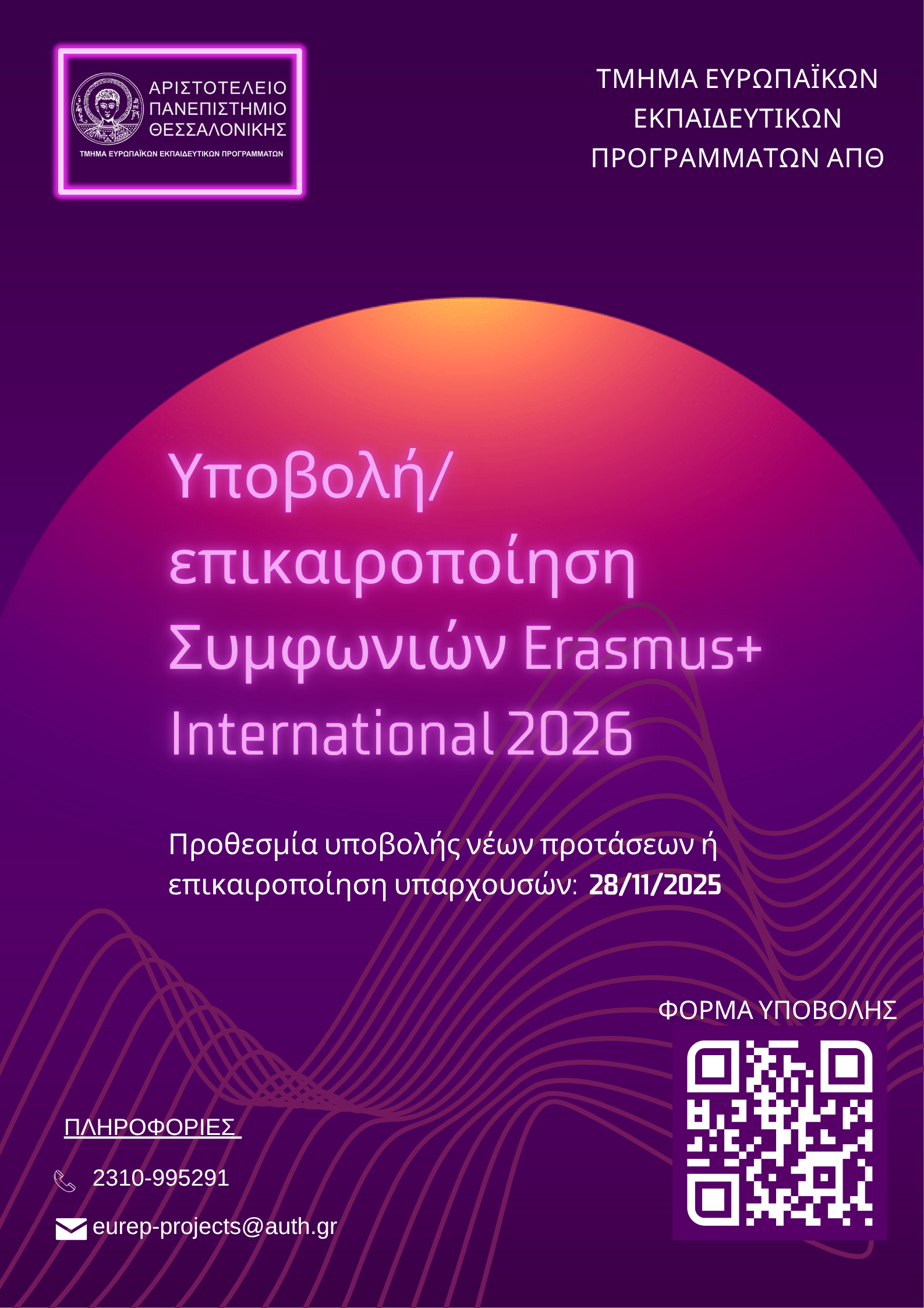 Ενόψει της προετοιμασίας της αίτησης του Ιδρύματός μας για το πρόγραμμα Erasmus+ Διεθνής Διάσταση (International) για την περίοδο 2026-2029, σας προσκαλούμε να υποβάλλετε νέες προτάσεις συνεργασίας ή/και να επικαιροποιήσετε υπάρχουσες συνεργασίες με ιδρύματα μίας ή περισσοτέρων χωρών εταίρων (Partner Countries) του προγράμματος. Σχετικά με τις χώρες εταίρους, παρακαλούμε επισκεφθείτε την ιστοσελίδα της Ευρωπαϊκής Επιτροπής https://ec.europa.eu/programmes/erasmus-plus/programme-guide/part-a/who-can-participate/eligible-countries_en και συγκεκριμένα την ενότητα «Third countries not associated to the Programme» regions 1-12.