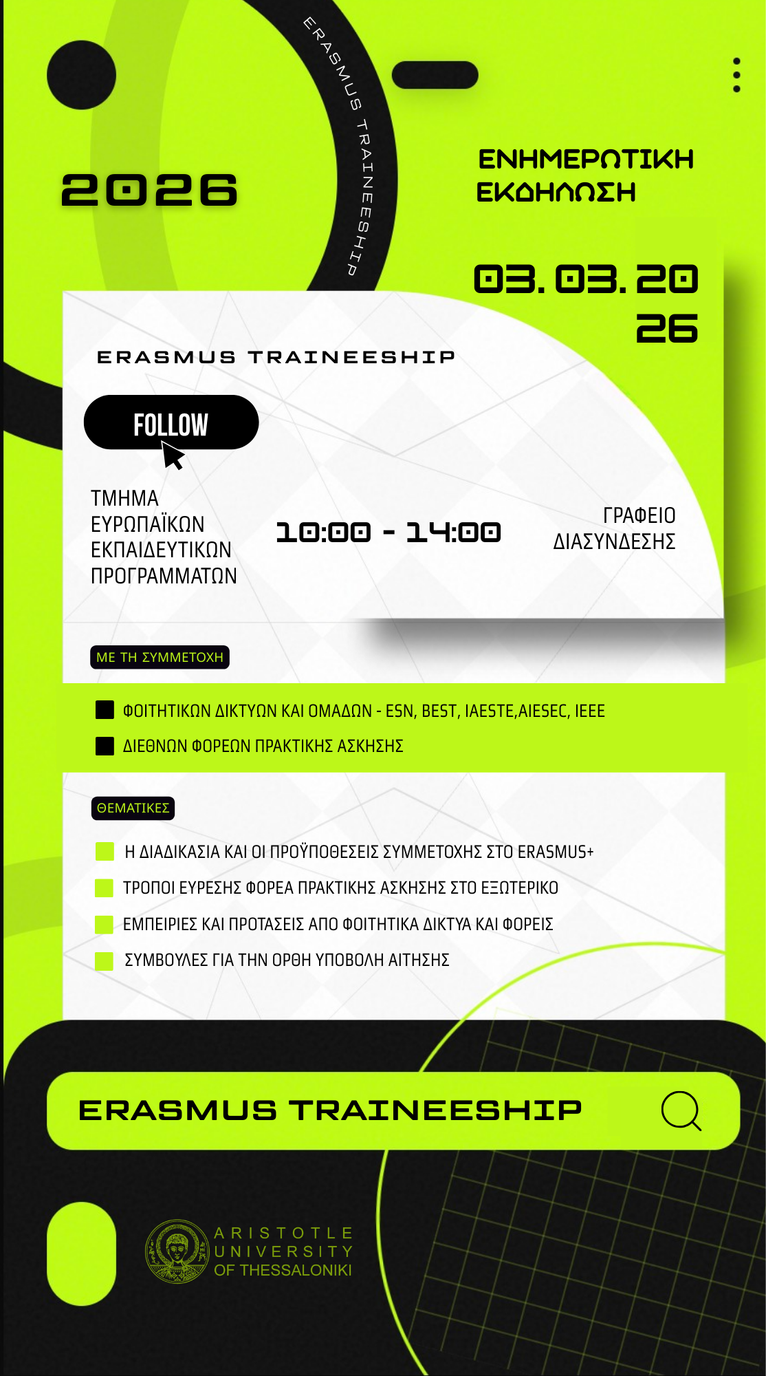 Ενόψει της πρόσκλησης υποβολής αιτήσεων για τη δράση Erasmus+ Πρακτική Άσκηση για το ακαδ. έτος 2026-2027 που θα ανακοινωθεί τον Μάιο του 2026, το Τμήμα Ευρωπαϊκών Εκπαιδευτικών Προγραμμάτων θα ενημερώσει όλους τους ενδιαφερόμενους/ες φοιτητές/τριες σχετικά με τις προϋποθέσεις συμμετοχής στο πρόγραμμα Erasmus+ για Πρακτική Άσκηση, την αναζήτηση Φορέα Υποδοχής, τη διαδικασία υποβολής αίτησης, και τη διαδικασία αξιολόγησης των αιτήσεων και επιλογής.