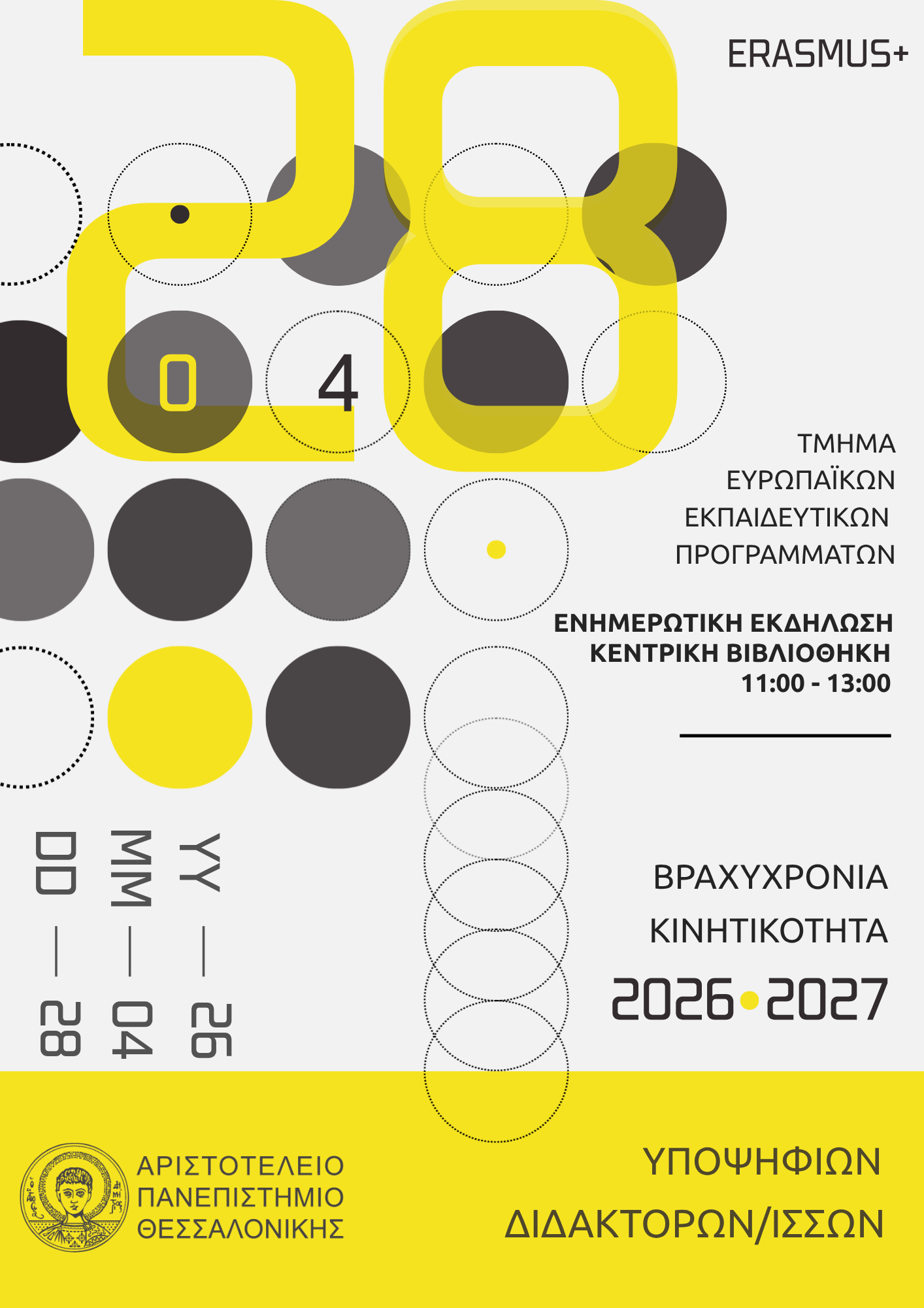 Στο πλαίσιο της πρόσκλησης υποβολής αιτήσεων για Erasmus+ Βραχυχρόνια Κινητικότητα Υποψήφιων Διδακτόρων/ισσών 2026-2027 θα πραγματοποιηθεί ενημερωτική εκδήλωση όπου θα παρουσιαστεί η δράση αλλά και εμπειρίες παλαιότερων μετακινούμενων υποψήφιων διδακτόρων/ισσών.