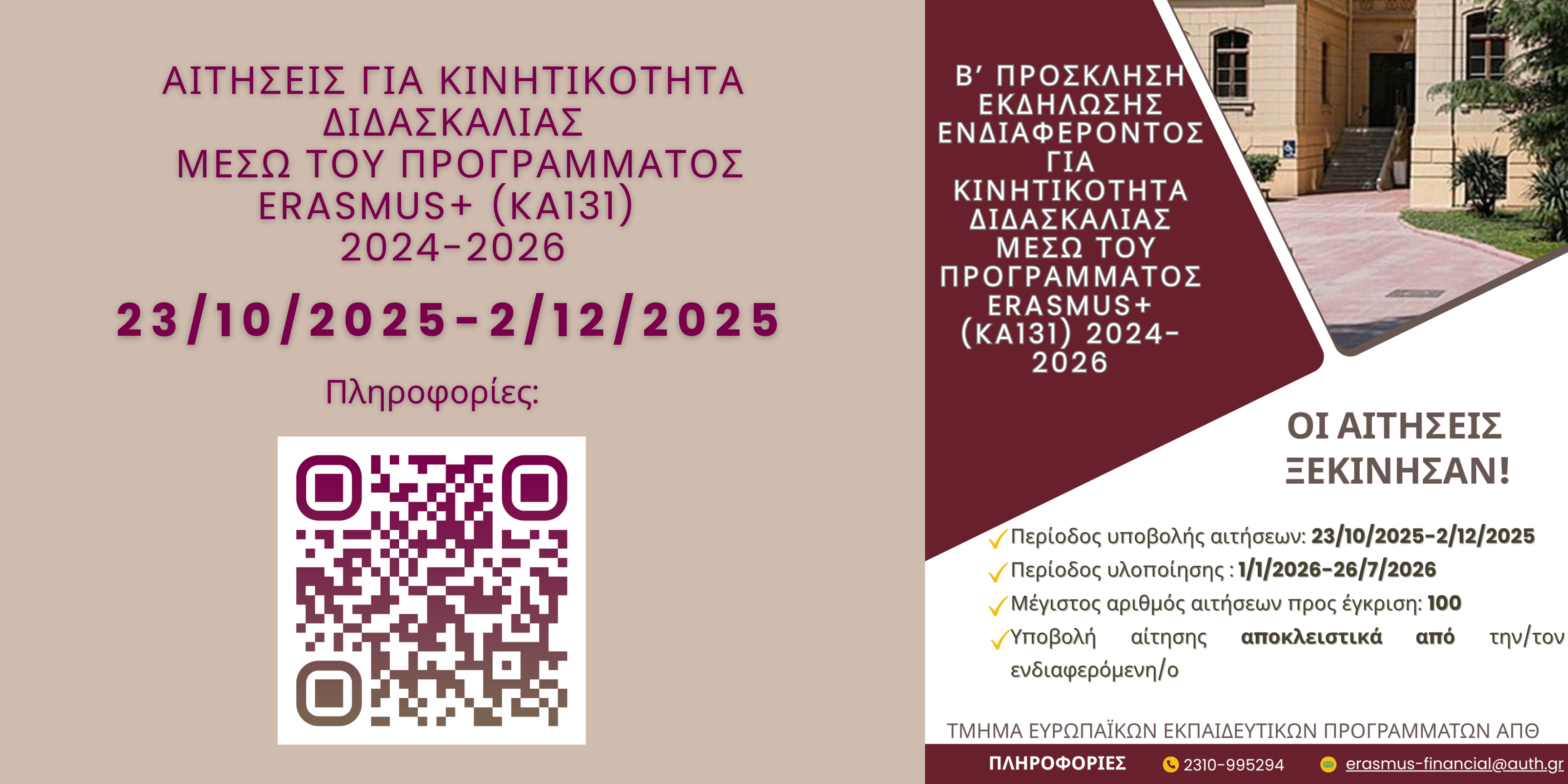 B΄ Πρόσκληση Εκδήλωσης Ενδιαφέροντος για κινητικότητα Διδασκαλίας μέσω του Προγράμματος Erasmus+ (KA131) 2024-2026
