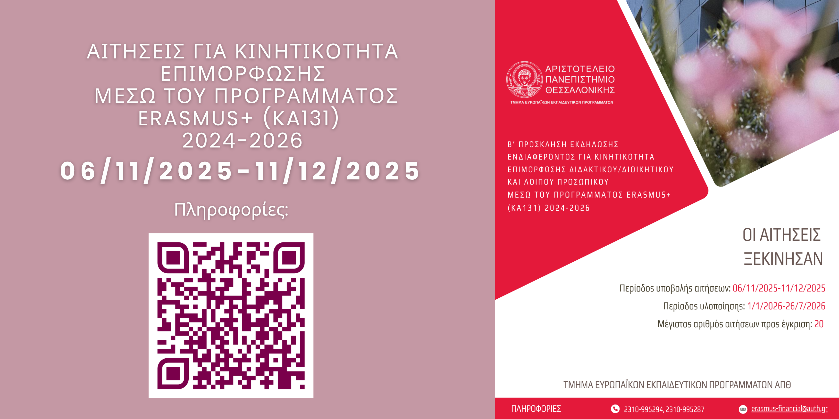 B΄ Πρόσκληση Εκδήλωσης Ενδιαφέροντος για κινητικότητα Επιμόρφωσης ΔΙΔΑΚΤΙΚΟΥ και ΛΟΙΠΟΥ Προσωπικού μέσω του Προγράμματος Erasmus+ (KA131) 2024-2026